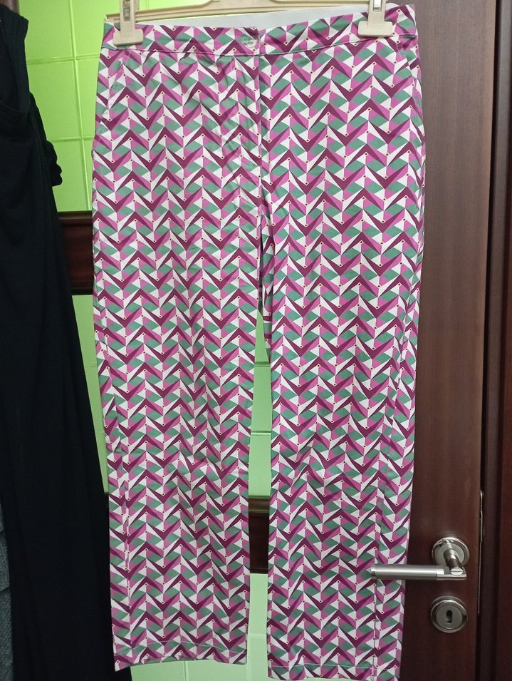 Kadınlar için normal boy midi uzunluğunda, pliseli ve desenli kumaş pantolon. Pastel çok renkli retro desenleriyle ofis için modern ve şık bir görünüm sunar.
