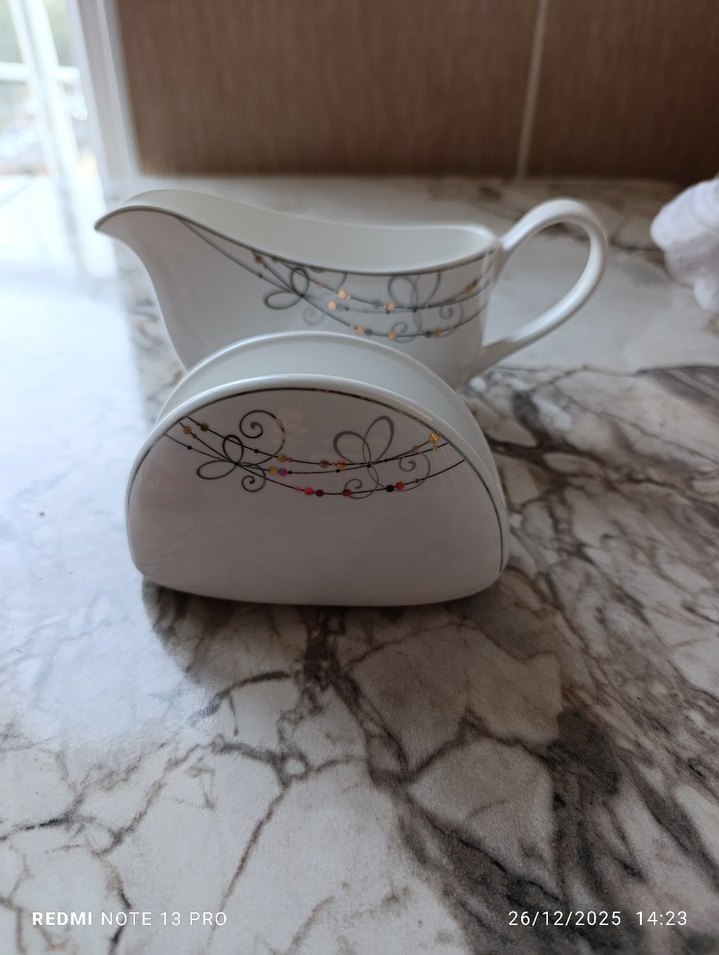 Gri desenli beyaz porselen sos kasesi, peçetelik uyumlu kapaklı ve zarif tasarımlı.