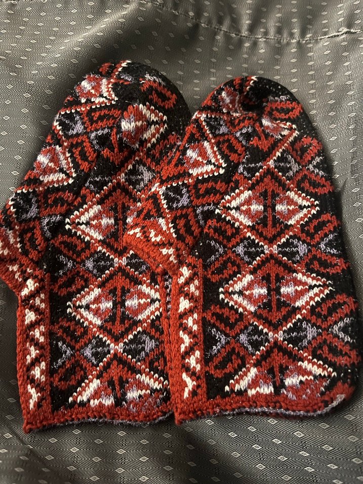 Koyu renkli, çok renkli desenlere sahip bu,bayan örme patiği.
