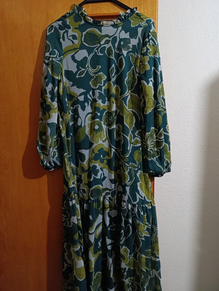 Yeşil baskılı, koyu canlı çiçek desenli elbise.