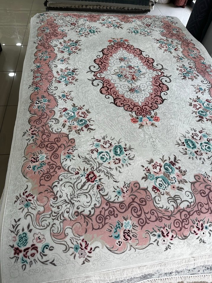 Konvansiyonel tarzda, pastel çok renkli çiçek desenlerine sahip baskılı halı.