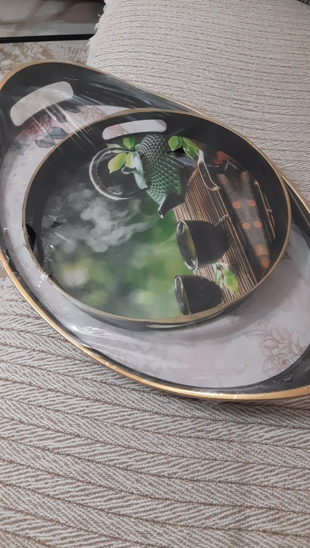Koyu renkte, desenli klasik tarzda tepsi seti. Kulplu ve parlak yüzeyli, üzerinde çay temalı görsel bulunur.