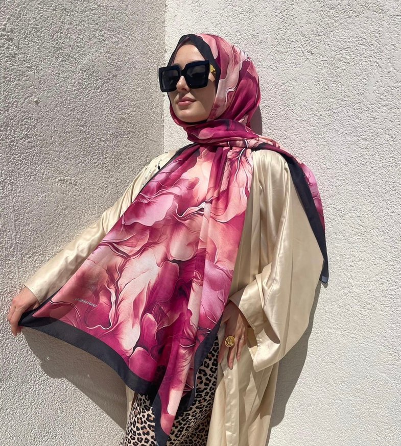 Kadın pembe, ipek görünümlü, drapeli şal, bohem ve sokak modası tarzında, şık ve trend görünüme sahiptir.