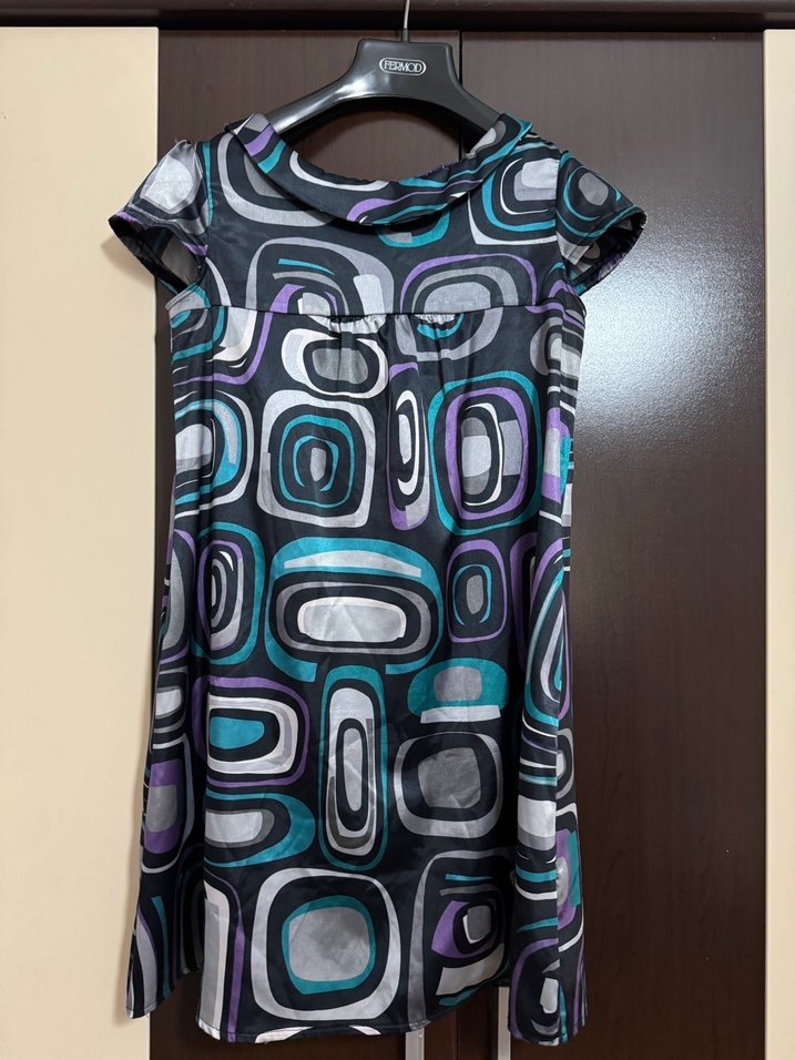 Desenli, salaş kesim hamile midi tunik. Drapeli kayık yaka ve kolsuz, canlı gri ve çok renkli desenli. Yumuşak sentetik kumaş, günlük kullanım için uygun.