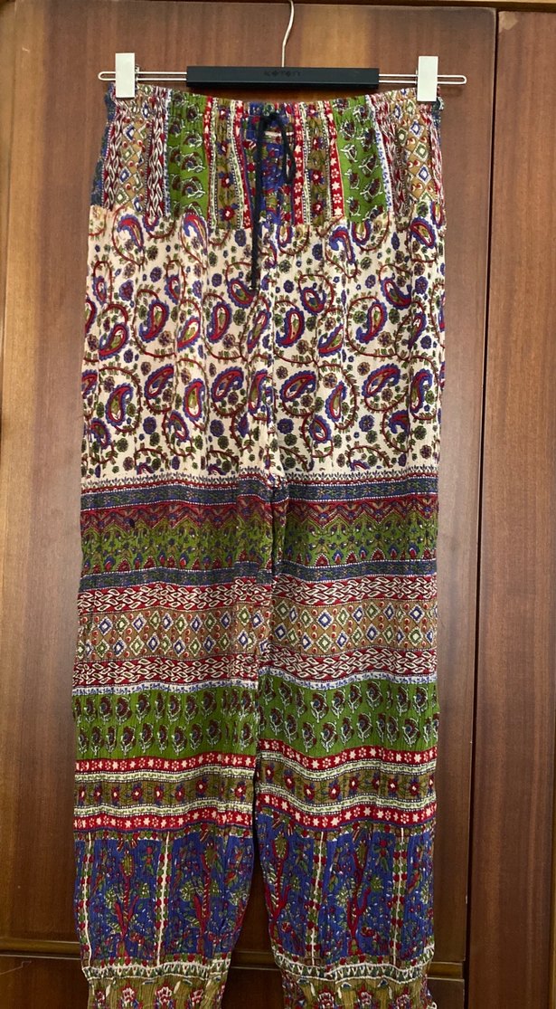 Bol kesim, uzun boylu kadın pantolon. Dokuma kumaştan, canlı renkli bohem desenlere sahip, günlük kullanıma uygun.