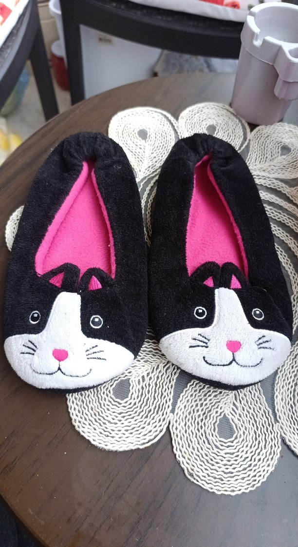 Siyahlı pembeli ev terliği.35-37 numara aralığı giyilebilir.Ürünün topuk kısmında küçük bir hasarı var.