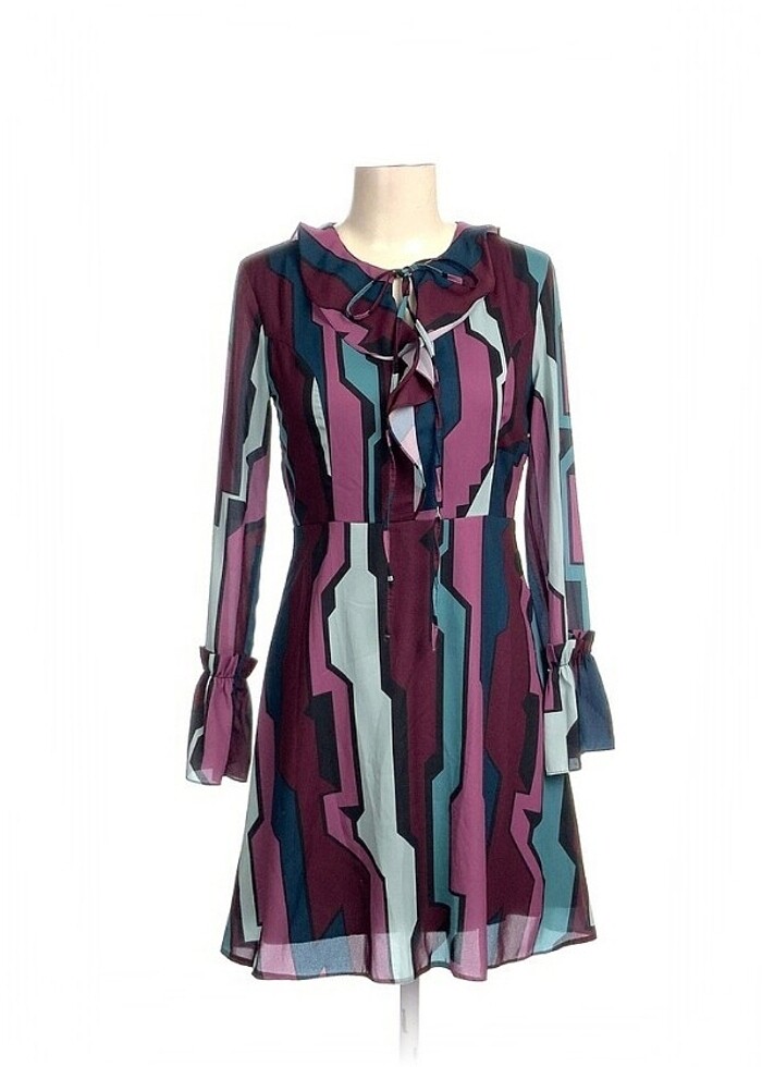 Desenli Şifon Fırfırlı Kısa Çan Elbise astarlı iç göstermez desenli fırfırlı bağlama detaylı Ölçüler Göğüs: 38cm, Uzunluk: 86cm