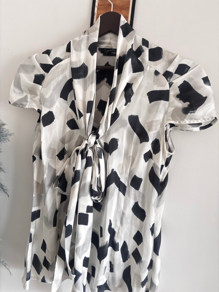 Gri beyaz tonlarda desenli şal v yaka dökümlü ipeksi kumaş şık bluz