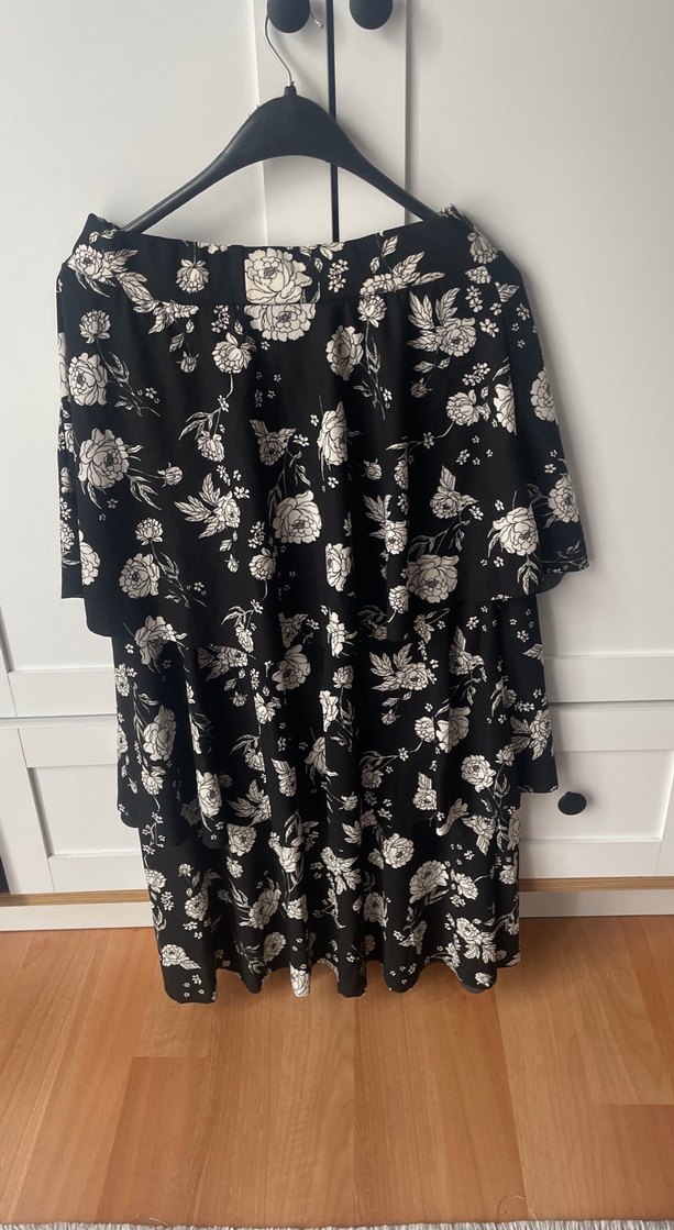 Siyah renkli, çiçek desenli midi eteği, bol ve drapeli kesime sahiptir. Yumuşak sentetik kumaştan yapılmış, günlük kullanıma uygundur.