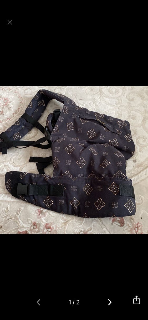 Ayarlanabilir kayışlar ve yastıklı bel kemeri ile desenli siyah bebek taşıyıcı.