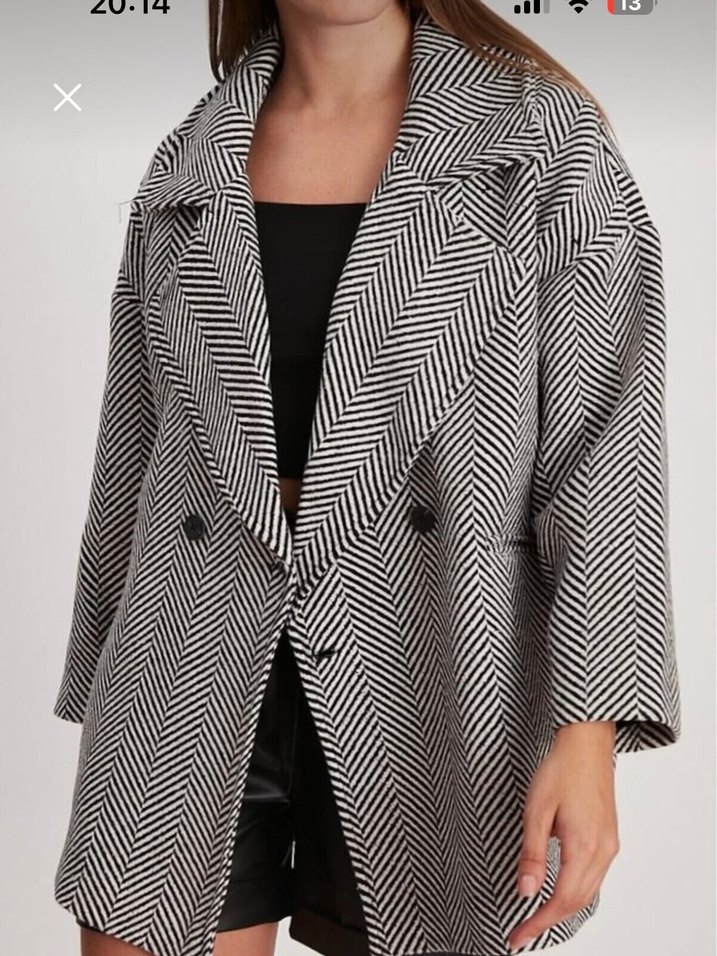 Geniş yakalı, çift düğmeli, siyah beyaz desenli rahat kesim kaban. Orta uzunlukta kollara sahiptir. Kol kısmının iç astarı yırtıkdır onun için uyguna vermekteyim fotoğrafta belirtilmiştir.