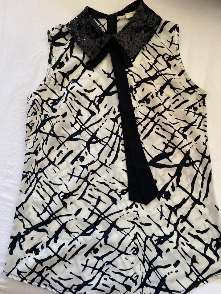 Kolsuz, fitted kesim halter yaka bluz, siyah-beyaz desenli, severek kullandım birkaç kere bedeni uymuyor diye satışta.