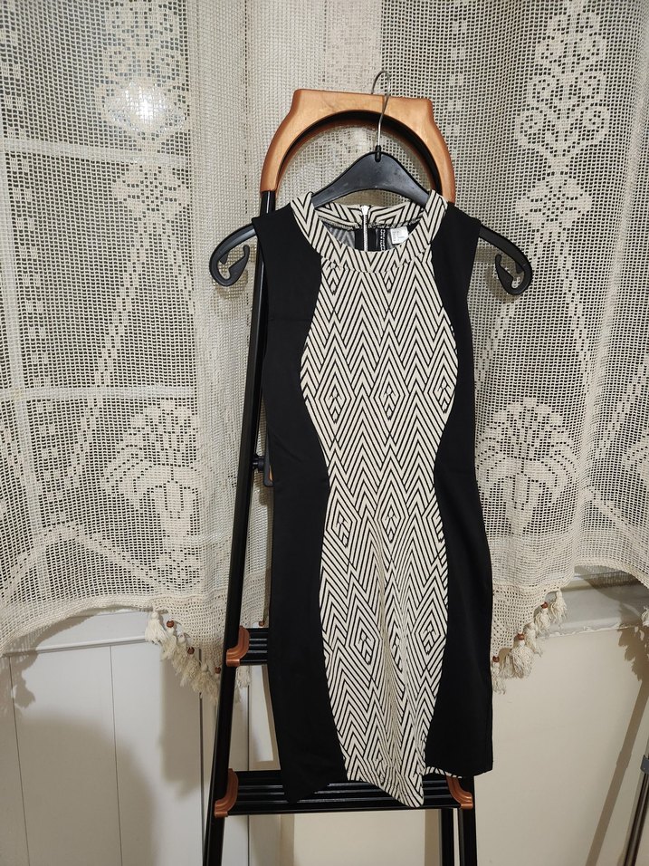 Vücuda oturan siyah ve beyaz desenli örme elbise. Kenarların siyah olması sayesinde beli hem ince gösteriyor, hem bele çok güzel oturuyor. esnektir. boyu 82 cm