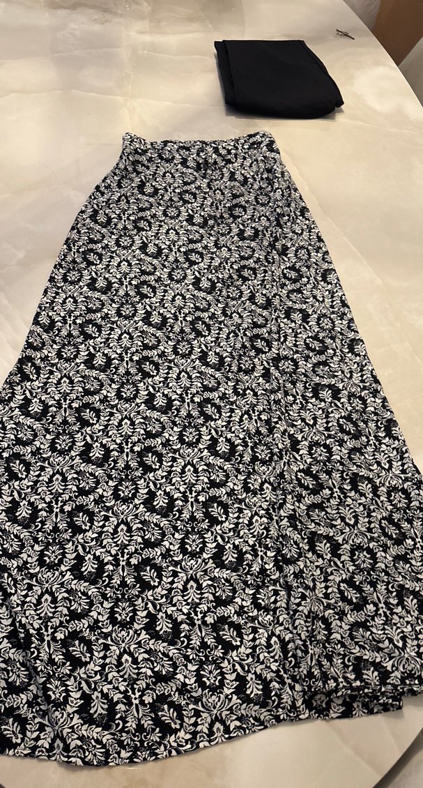 Desenli siyah tabanlı, beyaz desenli, drapeli ve vücuda oturan uzun etek. Sentetik kumaştan, minimalist ve bohem tarzına uygun, günlük kullanıma ideal.