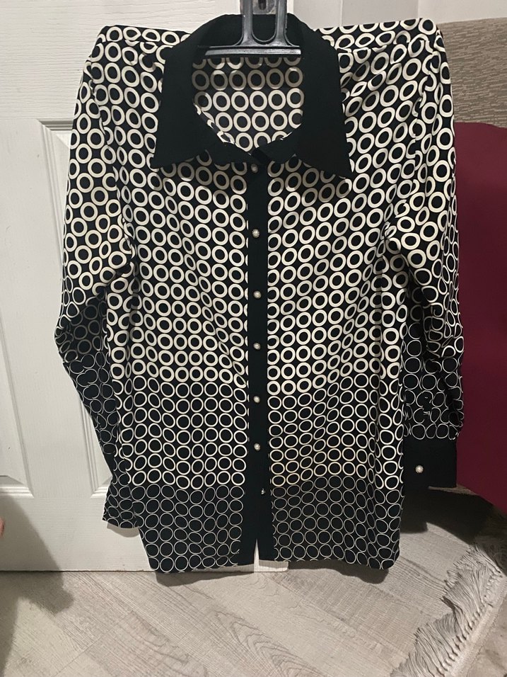 Düğmeli, yakalı ve uzun kollu, desenli siyah-beyaz midi uzunluğunda kadın gömleği. Sentetik kumaştan, iş ve günlük kullanıma uygun.