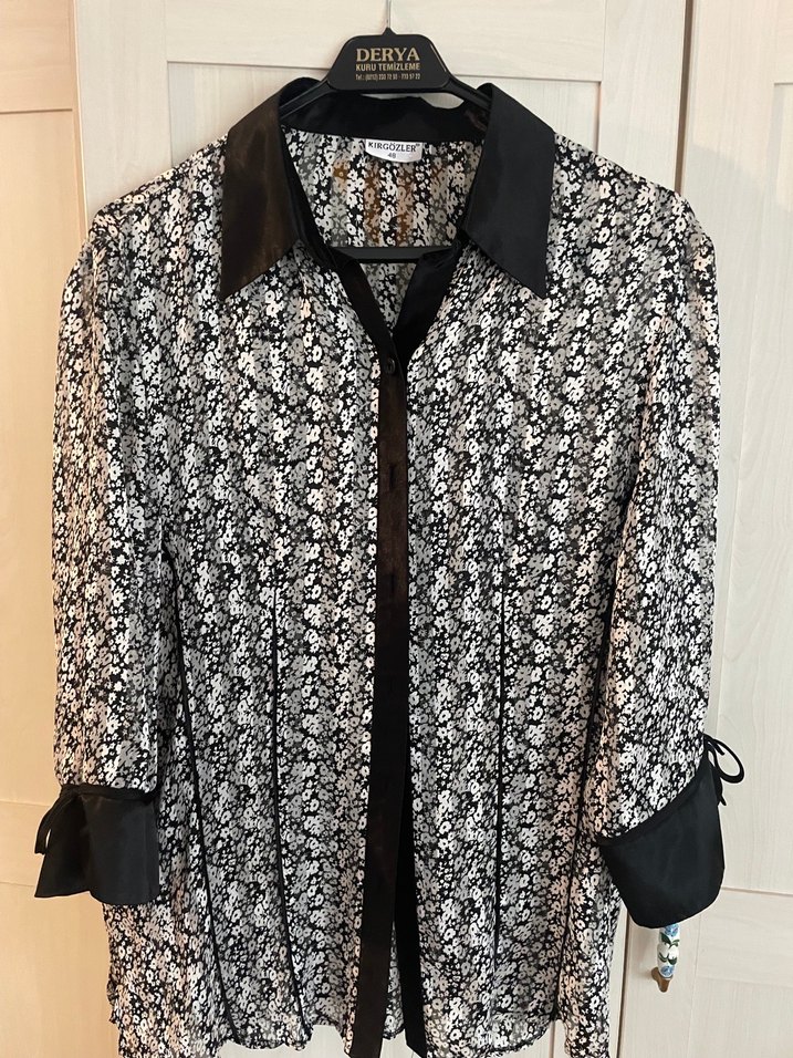 Bol kesim, düğmeli siyah gömlek. Uzun kollu, yakalı ve desenlidir. Ofis için uygundur, sentetik kumaştan üretilmiştir.