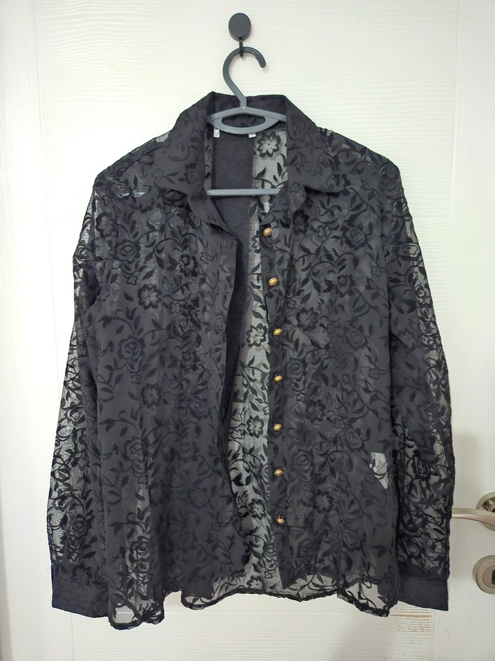 Hiç giyilmedi. Transparan siyah, desenli ve ipeksi kumaştan yapılmış kadın gömlek. uzun kollu ve metal düğmeli, bol kesimdir. Ofis için uygundur. marka temsilidir.