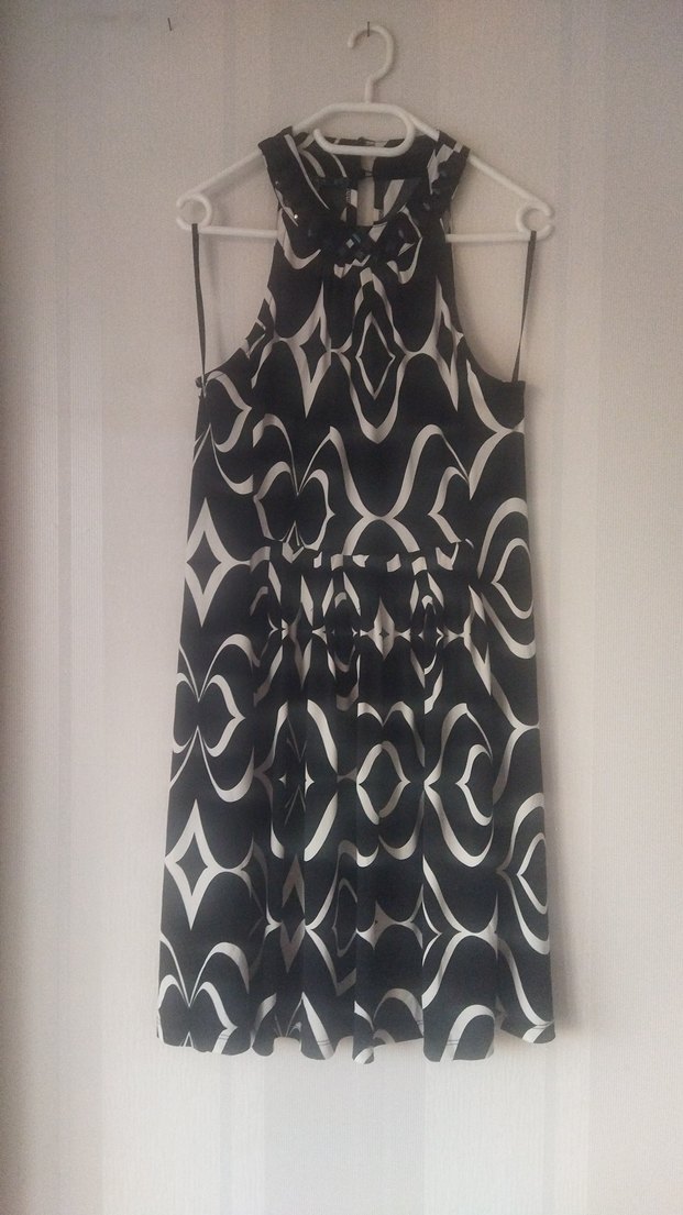 Bu siyah desenli midi elbise, yüksek yakalı ve askılıdır. vücuda oturan tasarımıyla günlük kullanıma uygundur. Boy 94 cm
