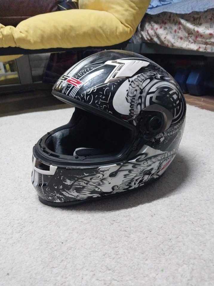 Desenli siyah ve gri seramik motosiklet kaskı, tokalı ve biker punk tarzına uygun.