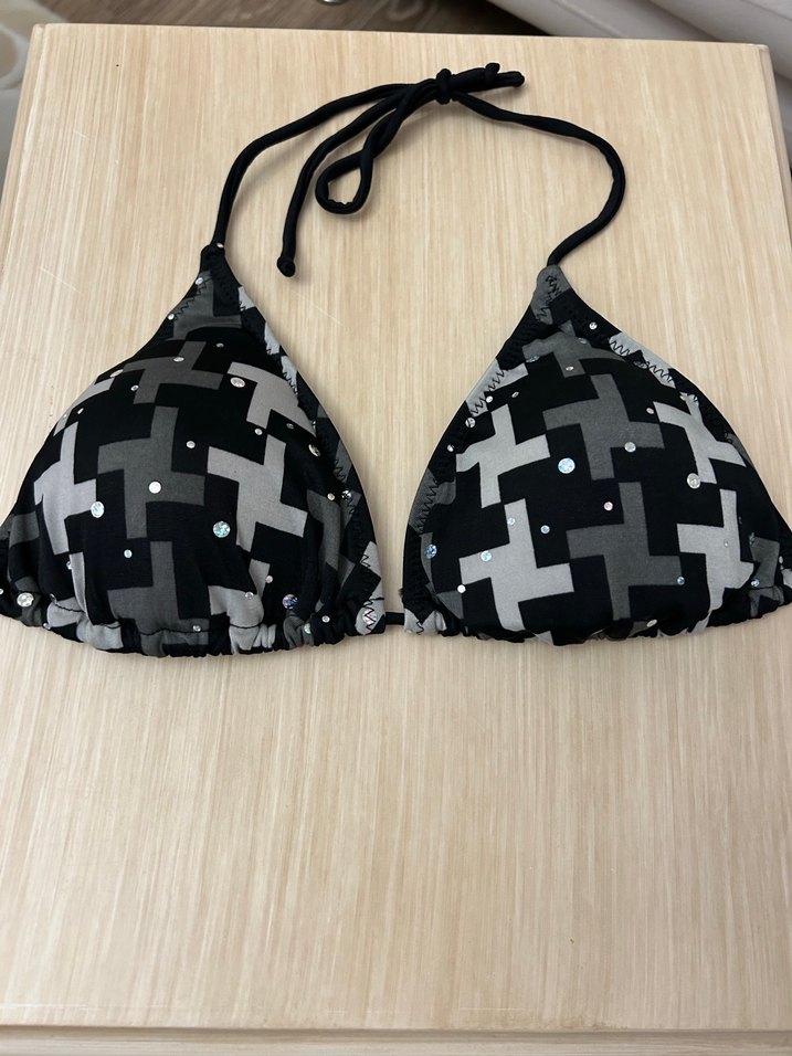 Desenli siyah ve gri renklerde, strappy askılı ve tokalı detaylı, vücuda oturan bikini üstü.Çok temiz kullanılmış kusursuz bikini üstü
