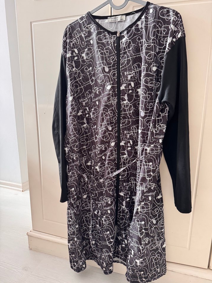 Siyah ve gri desenli, uzun kollu, fermuarlı, yuvarlak yaka haşema ama alt taytı yok 4XL