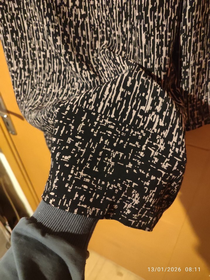 Siyah renkli, desenli hamile tunik; bol kesim, pile detaylı, uzun kollu ve yuvarlak yakalıdır. Günlük sokak stiline uygundur.