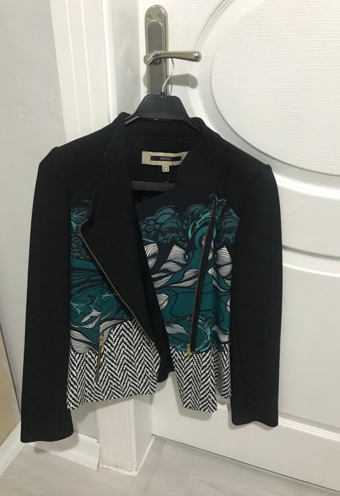 Bu dar kesim kadın cekette, yaka kısmında kesikli yakalı ve fermuarlı tasarım bulunur. Koyu renkli desenlerle uzun kollu, midi boyda sokak tarzı sunar. Sentetik kumaştan, günlük kullanıma uygundur. Sıkıntısı yok çok iyi durumda