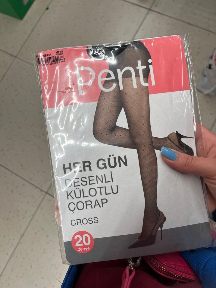 Cesur çapraz desenli, siyah ve normal uzunlukta, günlük kullanıma uygun külotlu çorap. 20 denye kalınlıkta ve pürüzsüz materyalden üretilmiştir. Kullanılmış