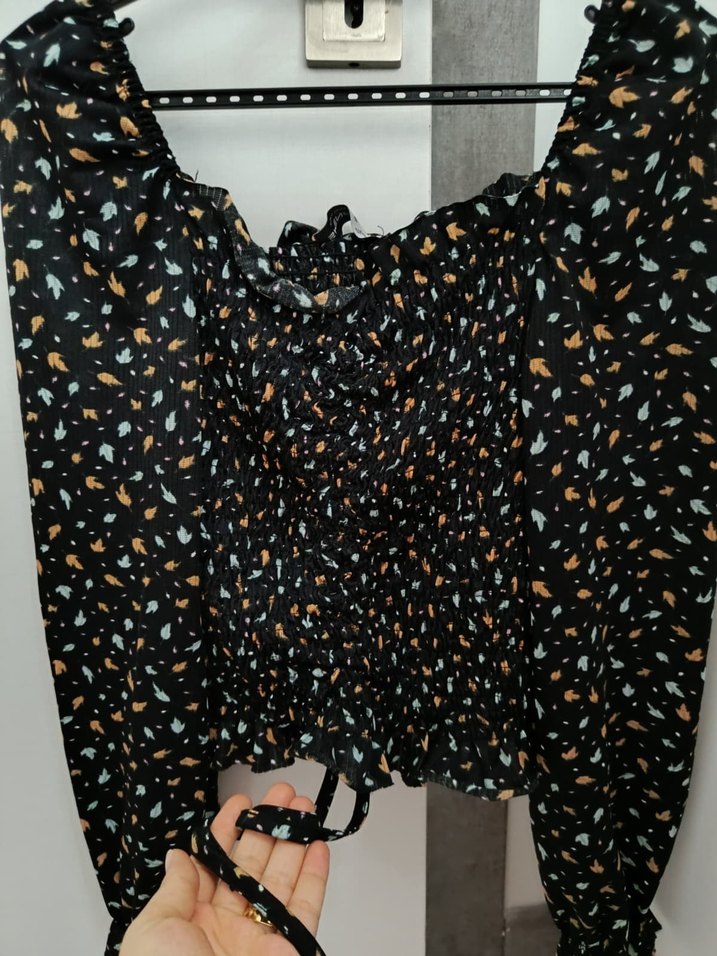Bu siyah bluz, uzun kollu ve kayık yakalıdır. Desenli detaylara sahip, sentetik kumaştan üretilmiştir. Günlük rahat kullanım için uygundur.