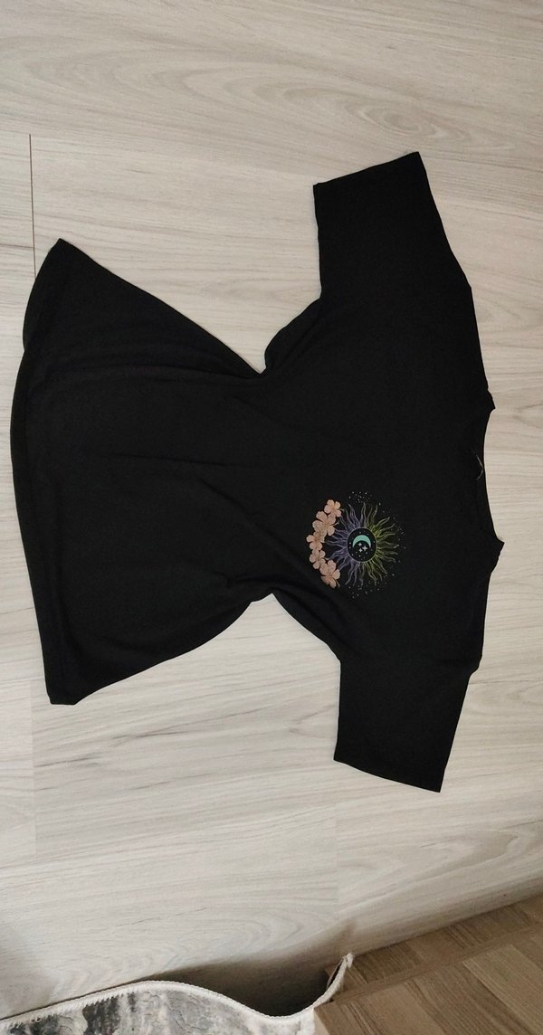 Siyah renkte, kısa kollu ve yuvarlak yakalı kadın tişörtü. Baskılı deseniyle rahat kesim, sentetik yumuşak kumaştan üretilmiştir. *Ürünün çok az belli olmucak kadar baskıları gitti.