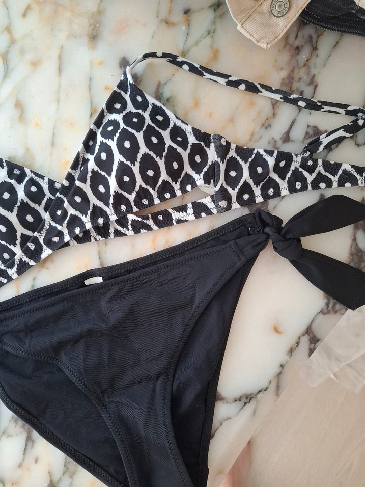 Desenli askılı üst ve kemerli siyah alt parçadan oluşan, bohem Paris tarzı günlük kullanıma uygun bikini takımı.