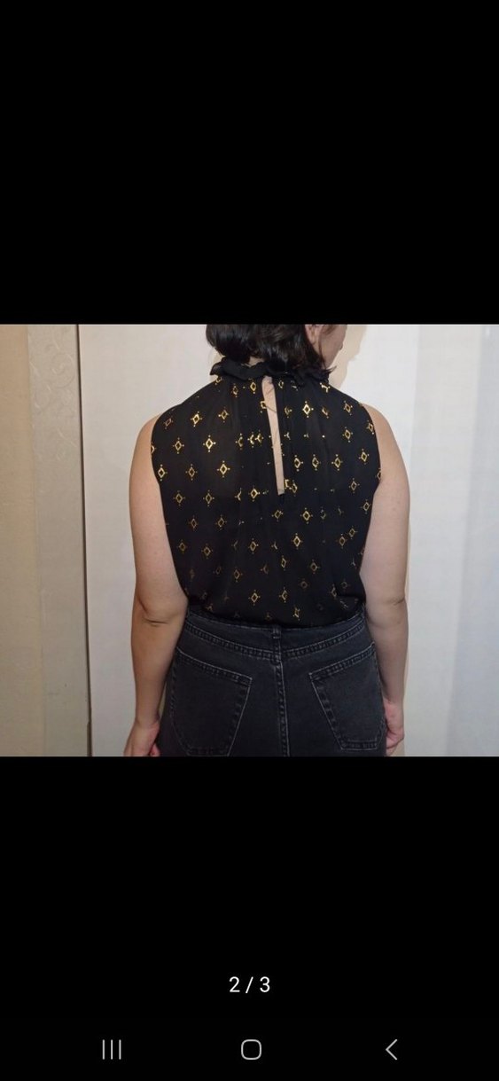 Koyu renkli, desenli ve kolsuz bu bluz yüksek yakalıdır. Belirgin tokalı detaylarıyla midi boyda, rahat sokak tarzına uygundur.