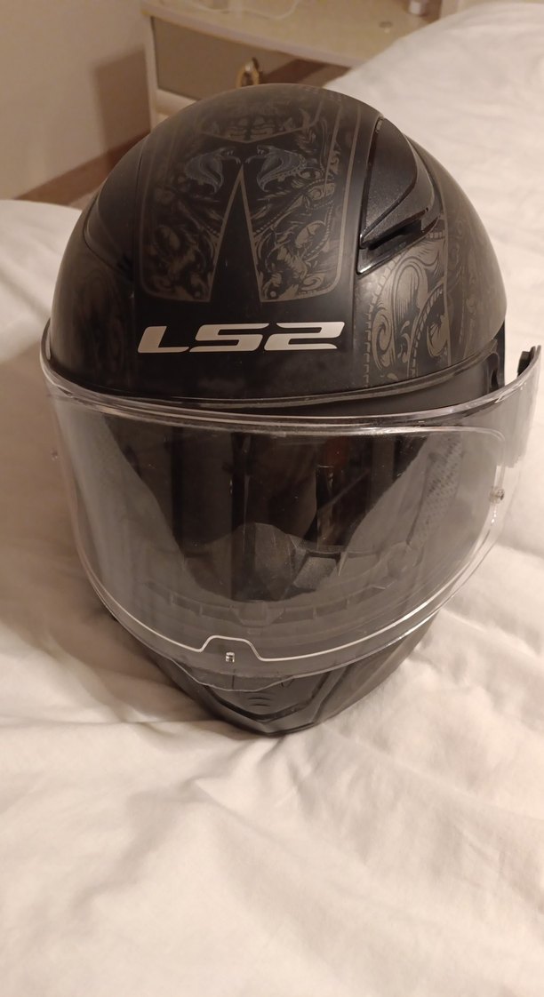 Desenli koyu siyah LS2 motosiklet kaskı, tokalı kayış ve şeffaf vizör ile rock punk havası taşıyor. ️ şeffaf kapak yenilenince yeniden farksızdır BEDEN XL