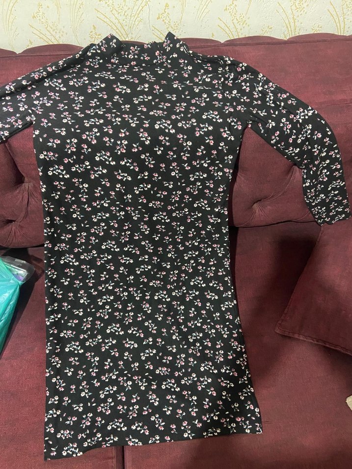 Düğmeli, uzun kollu, yüksek yakalı, sentetik kumaştan yapılmış, desenli siyah hamile midi tunik. Günlük ve sokak stiline uygun.