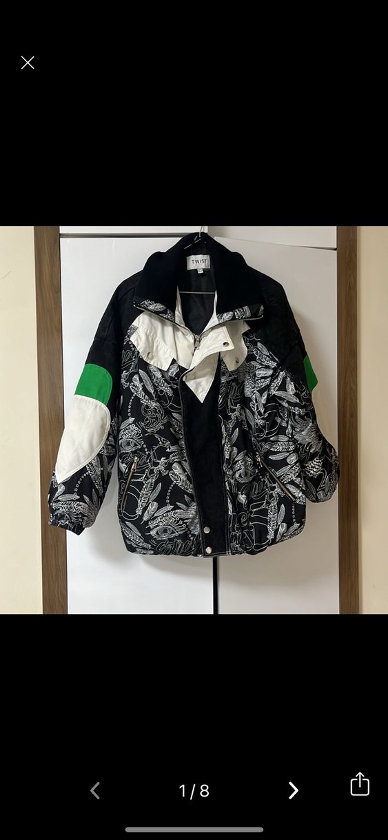 Bol kesim, yüksek yakalı ve uzun kollu kadın ceketi. Siyah, beyaz ve yeşil detaylı desenli, fermuarlı ve midi boyda, sokak stili için uygun.