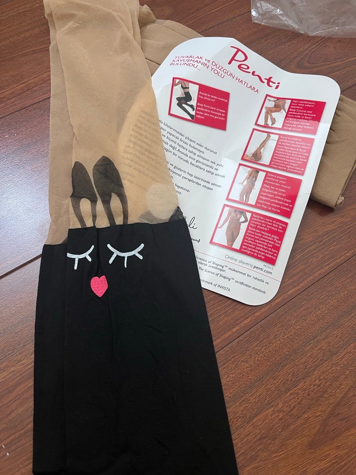 Fitted midi uzunlukta, uyuyan yüz ve kalp detaylı baskılı kadın çorabı. İnce, kağıt gibi materyalden, romantik gece için goth tarzına uygun.