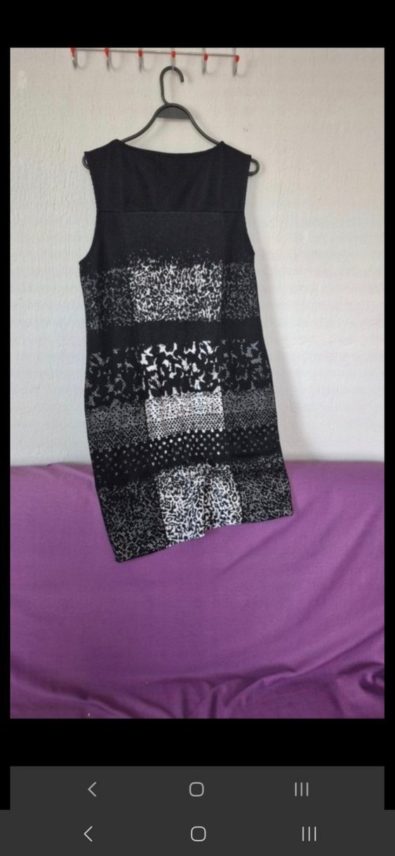 Dar kesim, kolsuz triko elbise, tekne yaka ve dantel detaylı, koyu tonlarda desenli, avangart tarz için uygun.
