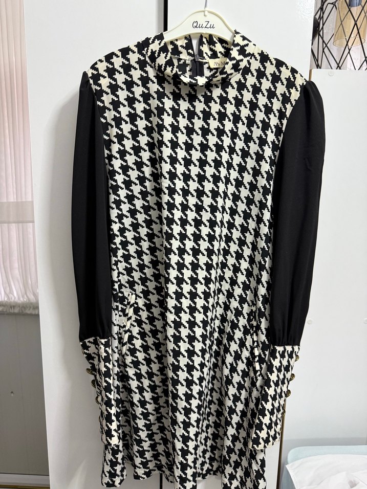 Yüksek yakalı, uzun kollu ve bol kesimli kadın tunik. Siyah beyaz desenli, pileli detaylı, günlük kullanıma uygun midi boy tunik.