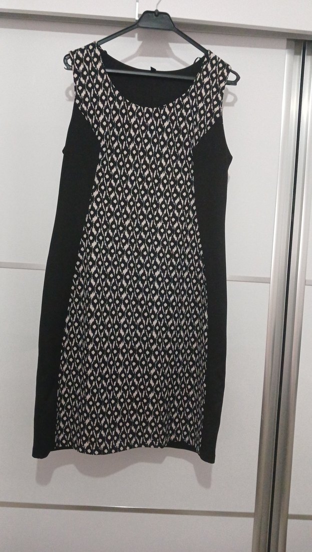 Kolsuz, desenli ve pile detaylı siyah midi triko elbise. Modern ve minimal tarzı günlük kullanıma uygun şekilde sunar.