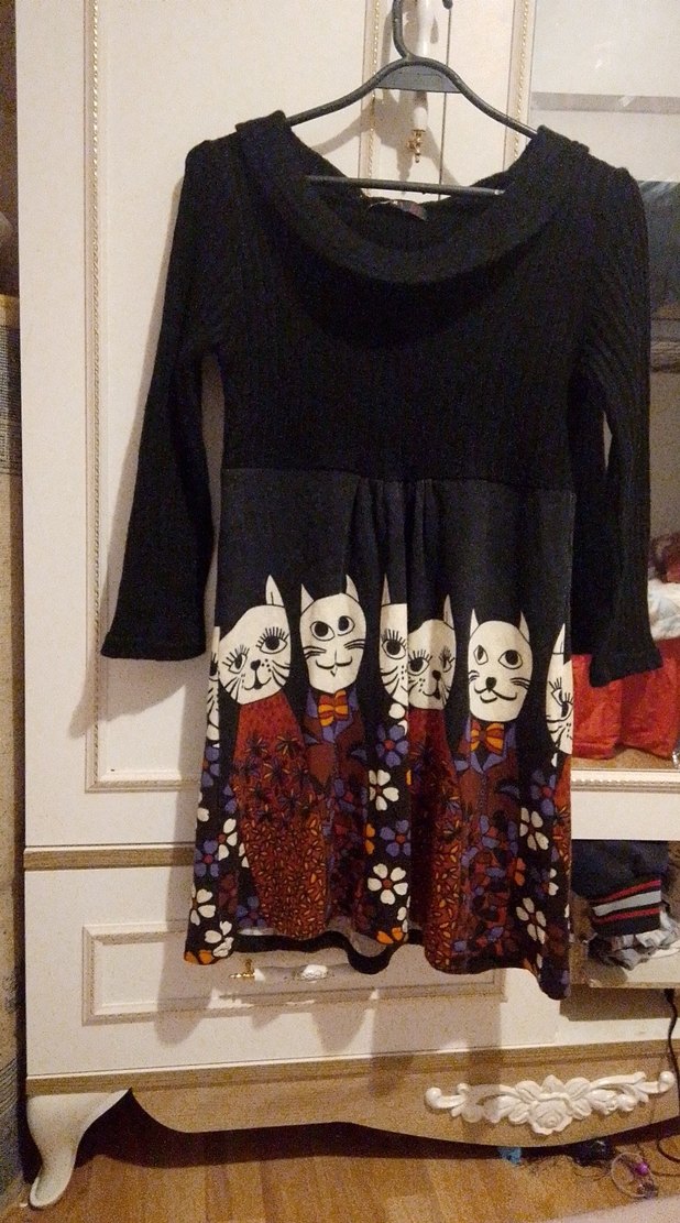 Siyah renkli, uzun kollu, örgü kumaştan yapılmış goth tarzı elbise, desenli alt kısmında karanlık tonlarda çizilmiş kedi figürleri bulunur.