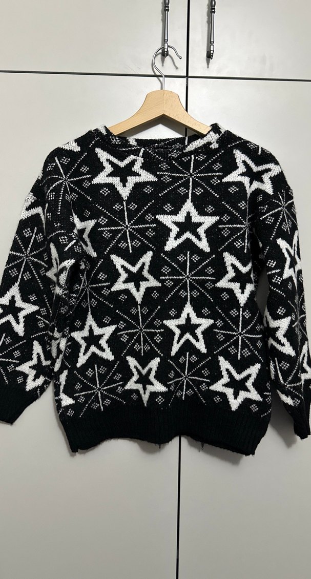 Desenli yıldız desenli siyah örgü kadın kazak, uzun kollu ve yuvarlak yakalıdır. Rahat kesimiyle bohem ve sokak stilini yansıtır, günlük kullanım için uygundur. ❄️ s ve m beden için uygundur.