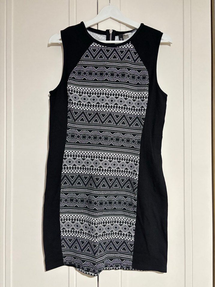 Kolsuz, yüksek yakalı, desenli ön paneli olan, vücuda oturan elbise. Yumuşak sentetik kumaştan örme detaylı. Günlük sokak stili için uygun.