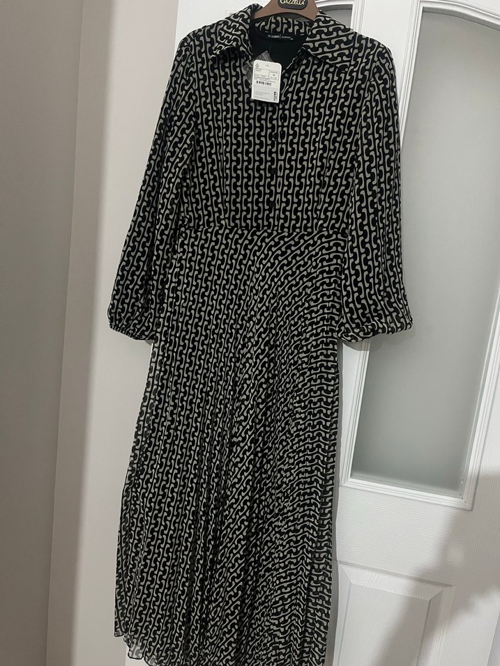 Desenli siyah uzun elbise, kesik yakalı, uzun kollu ve piliseli detaylara sahip bol kesimdir. Sentetik kumaşı ile ofis için modern Paris tarzını yansıtır. L.c Waikiki marka etiketli yeni