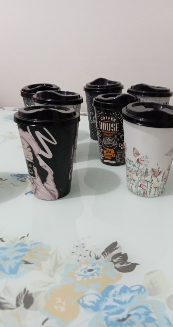 Çeşitli sanat ve kahve temalı desenlere sahip, plastik kapaklı siyah bardak seti. Sıcak içecekler için uygundur. ☕