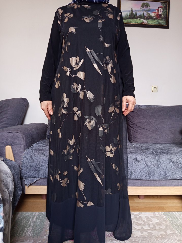 Desenli, yüksek yakalı ve uzun kollu siyah uzun kadın elbisesi, bol ve dökümlü kesime sahiptir. Sentetik kumaştan yapılmıştır, modest ve bohem tarzlara uygundur.