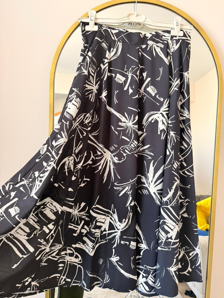 Sentetik kumaştan üretilmiş, dökümlü ve bol kesim siyah uzun etek. Günlük kullanıma uygun, Paris tarzı desenli ve çağdaş tasarım.