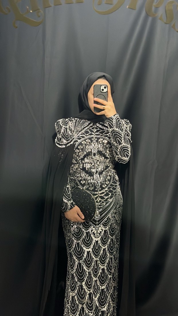 Desenli, yüksek yakalı ve uzun kollu, siyah renkte drapeli ve vücuda oturan uzun abiye elbise. Modest ve göz alıcı bir stil için uygun. Giy gönder 1.800₺ Şal ve çanta dahil