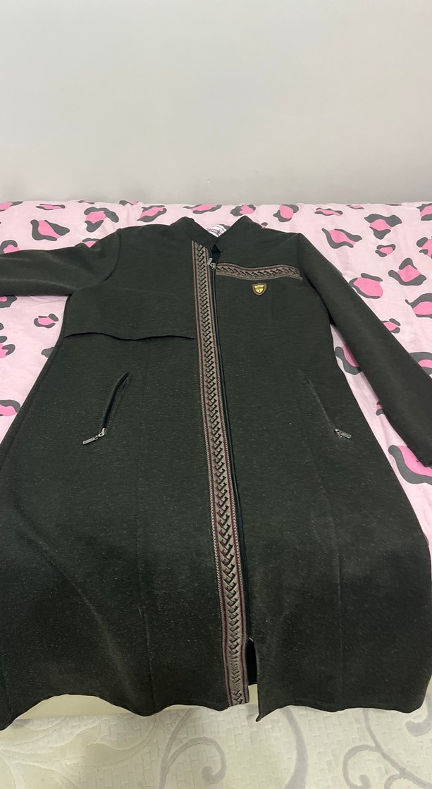 Desenli, siyah renkli, uzun ve fitted kesim hamile ceketi. Notch yakalı, fermuarlı ve yan cepli, yumuşak ve sıcak kumaştan, rahat sokak stili için uygun.