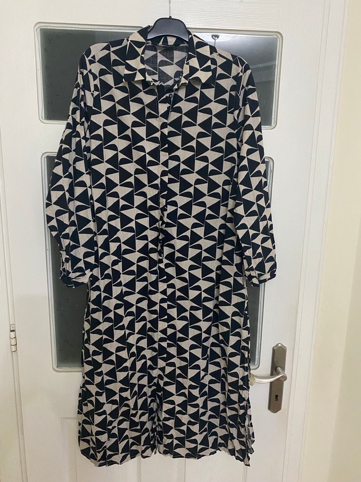 Siyah-beyaz geometrik desenli, V yakalı ve düğmeli uzun tunik.Uzun kollu, bol kesim, bohem ve sokak stili etkileri taşır. Günlük kullanıma uygun sentetik kumaş. LCW ürünüdür 3 defa giyildi.