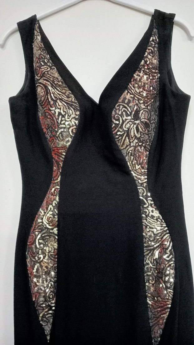 V yaka ve kolsuz, desenli yan panelleri ve fermuar detaylı, dar kesim siyah uzun gece elbisesi. Avant-garde tarz için uygundur.